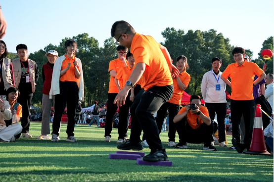 摸石头过河接力,要求老师们高度协作,团结一致,聚精会神,将所有的目光聚焦在“石头”上,并根据“石头”的摆放位置不断调整。在一旁围观的学院啦啦队也屏气凝神,为参赛者提供最好的环境。偶有“石头”偏离轨道,大家也都不慌张,一旁指挥的老师迅速将“石头”调整好继续进行,不浪费一分一秒。