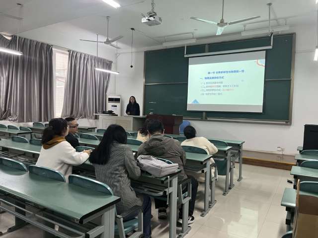 本次备课活动由卫莉老师主讲。她首先介绍了本学期原理课的课堂教学进度,接着对“马克思主义基本原理”第一章第一节第一目“物质及其存在方式”中的“哲学及其基本问题” “哲学的物质范畴” “物质的存在方式”“物质世界的二重化”这四个问题进行讲解,主要向大家呈现了本部分的重难点问题、课件和教案,以及如何设计讨论环节等。最后,讲到“哲学与科学”和“哲学与民族”两个具体问题,卫老师用英国和德国诺贝尔物理学奖的获得情况阐明哲学对科学的影响,认为,正是受康德理性主义哲学的浸染,以理性思维渐长的德国科学家才在现代科学阶段走到了最前列。针对这一观点,老师们提出了一些质疑,就哲学对民族的影响、哲学在中国所发挥的作用以及中国诺贝尔奖获得之路为何如此艰难等问题进行了热烈探讨。