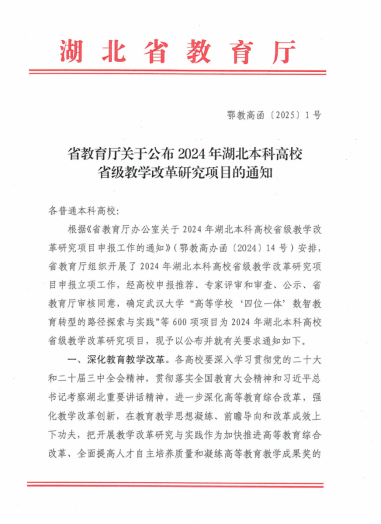 近日,湖北省教育厅公布2024年湖北本科高校省级教学改革研究项目名单,我院两个项目喜获立项。