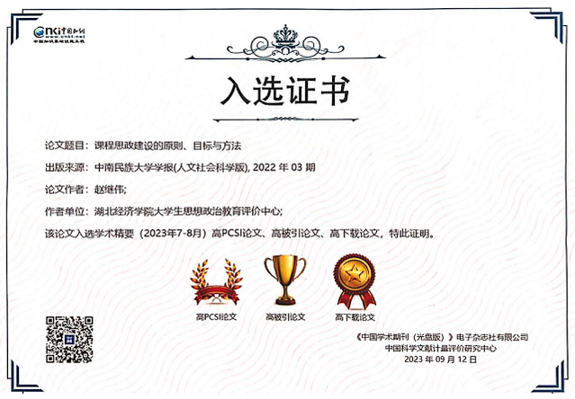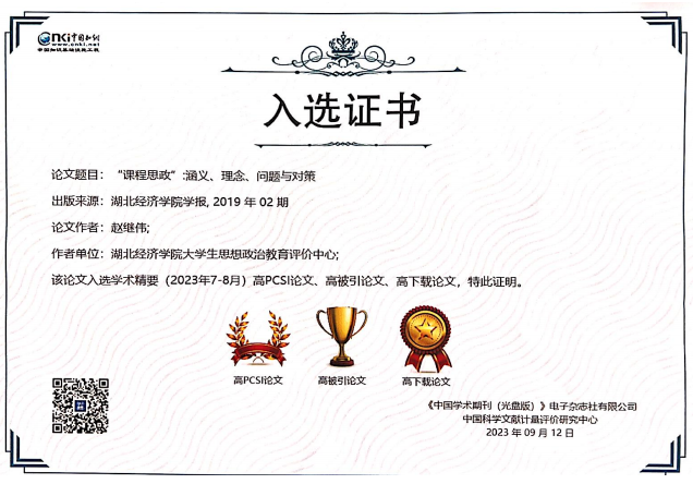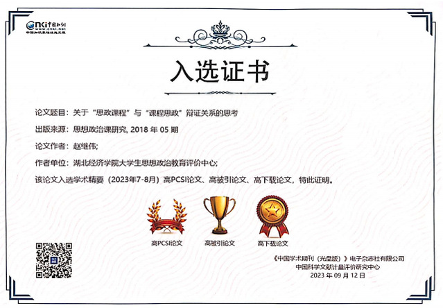 (通讯员:马岩)近日,中国知网发布《中国知网(CNKI)学术精要》高PCSI论文、高被引论文、高下载论文名录。我院院长赵继伟教授发表于201820192022的三篇科研论文均名列其中。赵继伟教授长期扎根于思想政治教育学科发展、高校思政课教学改革创新方面研究,在课程课程的内涵与实质、思政课程与课程思政辩证关系研究等方面屡有创见,在学界产生了热烈反响。