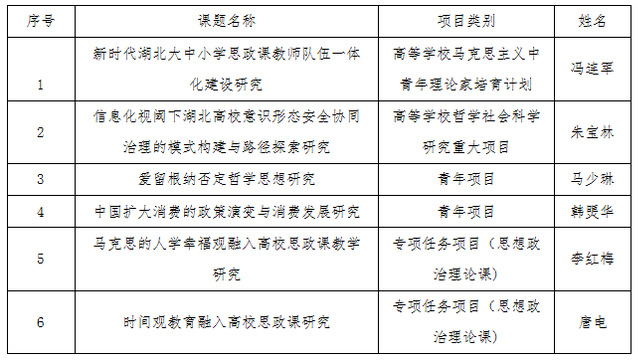(通讯员 马岩)日前,湖北省教育厅、湖北省哲学社会科学工作领导小组办公室公示了2023年度省社科基金前期资助项目、哲学社会科学研究项目和专项任务项目立项名单,我院获批省社科基金前期资助项目2项,其中高等学校哲学社会科学研究重大项目1项,高等学校马克思主义中青年理论家培育计划项目1项;获批哲学社会科学研究项目2项,专项任务项目2项。