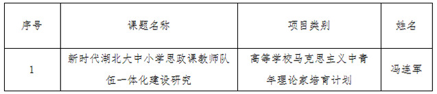 (通讯员:马岩)近日,湖北省教育厅公布了2023年度省社科基金前期资助项目评审结果,我院习近平新时代中国特色社会主义思想概论教研室主任冯连军副教授入选湖北省高等学校马克思主义中青年理论家培育计划(第十批)。