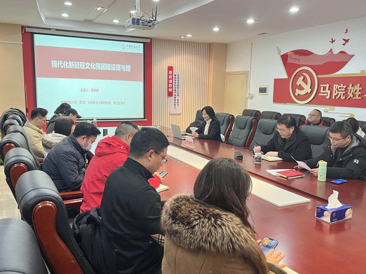 (通讯员:叶欣明)为深入学习贯彻党的二十大精神、加强习近平文化思想的学习领会,1月18日下午,我院特邀中国地质大学(武汉)太阳成tyc7111cc集团二级教授、博士生导师,“地大学者”领军人才,重庆“巴渝学者”讲座教授,国家社科基金重大项目首席专家韩美群作“中国式现代化文化强国建设的理与路”的讲座,讲座由副院长谭绍江主持,院长赵继伟、副院长王海涛及全体教师参加。