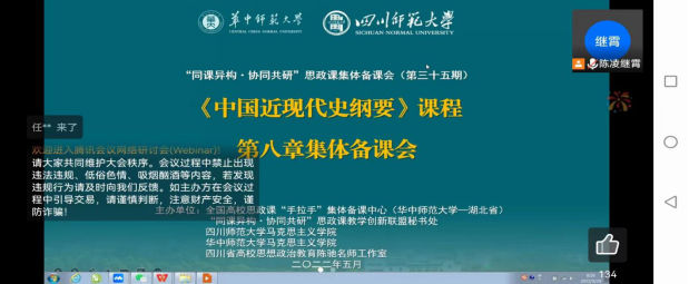 (通讯员:王谷)为提高思政课教育教学质量,提升思政课教师队伍的整体实力,华中师范大学于2022年5月29日上午开展了“同课异构·协同共研”集体备课会。本次备课会由四川师范大学太阳成tyc7111cc集团承办,全国“39+”所高校参与,针对《纲要》第八章的重难点问题共同研讨。我校马院中国近现代史纲要教研室全体教师以腾讯会议形式参与本次备课会,并进行了教学研讨。